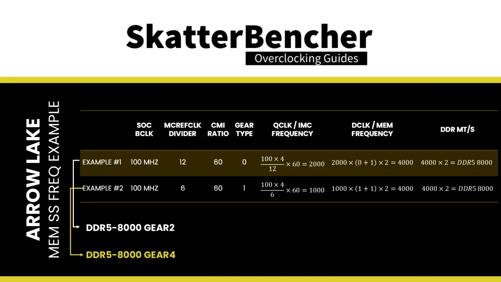 In the first example, we use an MCRefClk of 33 MHz, Gear 2, and a CMI Ratio of 60. That gives us a Memory Controller frequency of 2 GHz, a memory frequency of 4GHz, and DDR5-8000 data rate. In the second example, we change the Refclk divider to 6 and use Gear 4. Now, we still have DDR5-8000 system memory but the Memory Controller is running at 1 GHz instead.