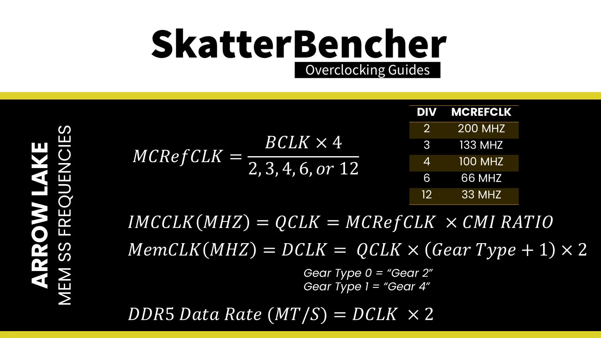 In the first example, we use an MCRefClk of 33 MHz, Gear 2, and a CMI Ratio of 60. That gives us a Memory Controller frequency of 2 GHz, a memory frequency of 4GHz, and DDR5-8000 data rate. In the second example, we change the Refclk divider to 6 and use Gear 4. Now, we still have DDR5-8000 system memory but the Memory Controller is running at 1 GHz instead.