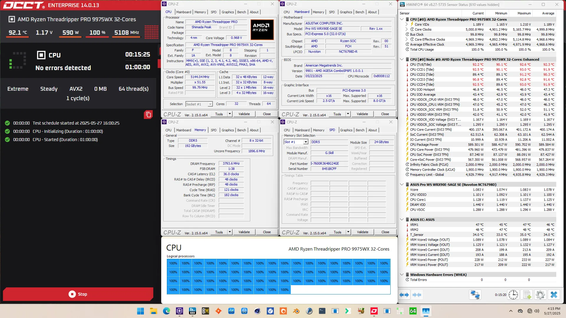 We overclock and undervolt the AMD Ryzen Threadripper Pro 9975WX to 5625 MHz with the ASUS Pro WS WRX90E-Sage SE motherboard and custom loop liquid cooling.