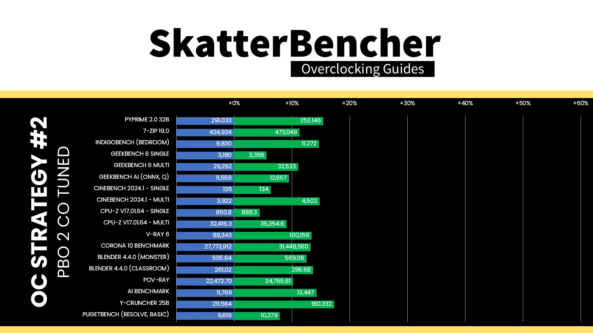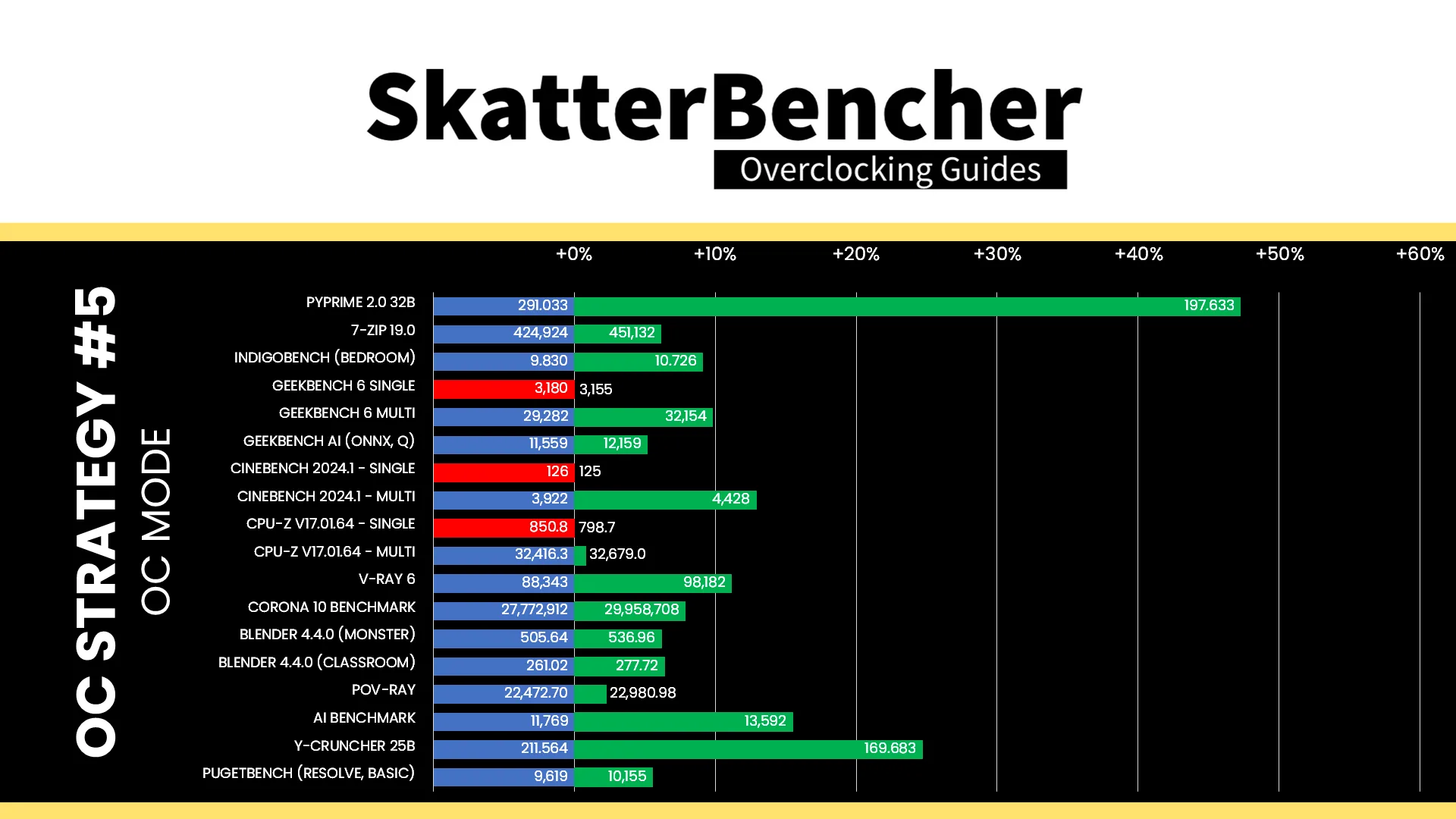 While the Ryzen Threadripper Pro 9975WX is definitely limited by power, as we saw in stress test results of the previous OC strategy, unleashing the power doesn’t have an enormous impact on performance. However, the performance uplift is pretty uniform across the board. The Geomean performance improvement is +4.93%, and we get a maximum improvement of +14.93% in PyPrime.