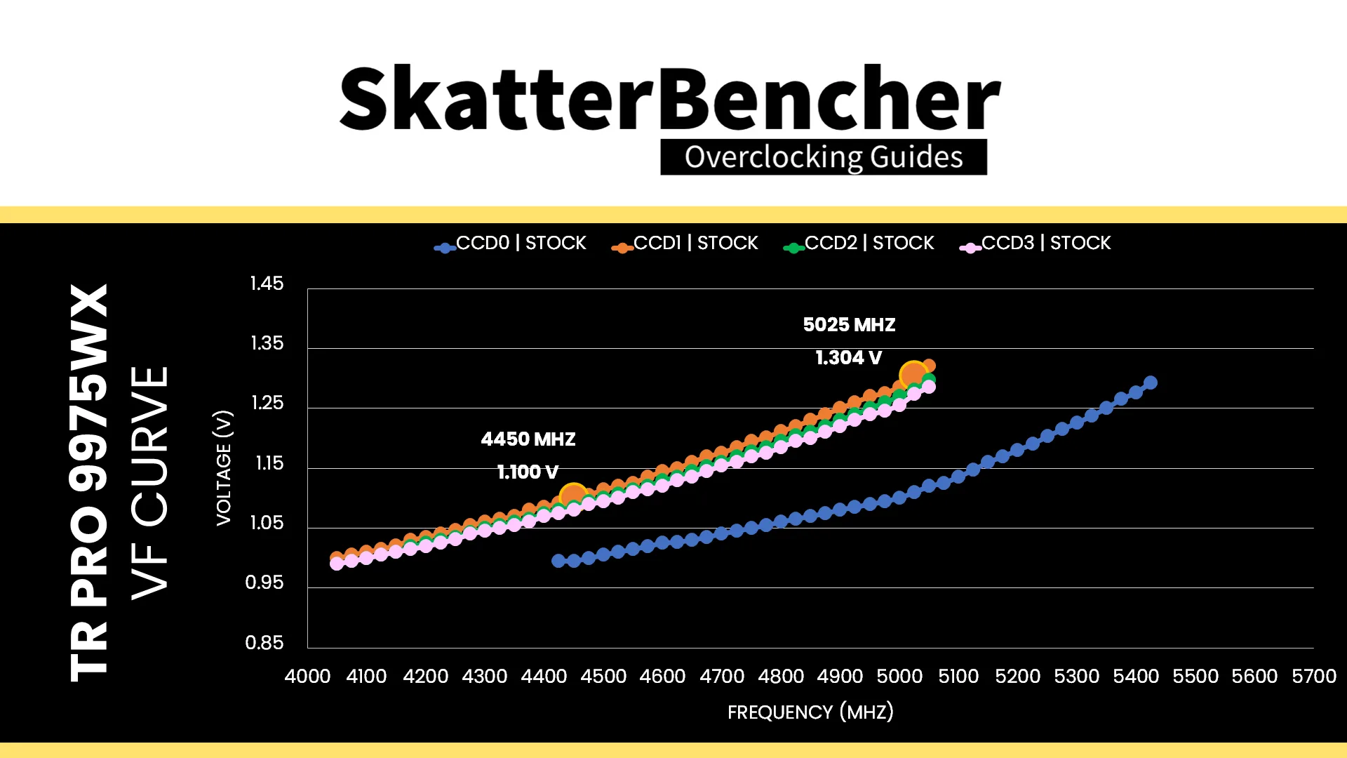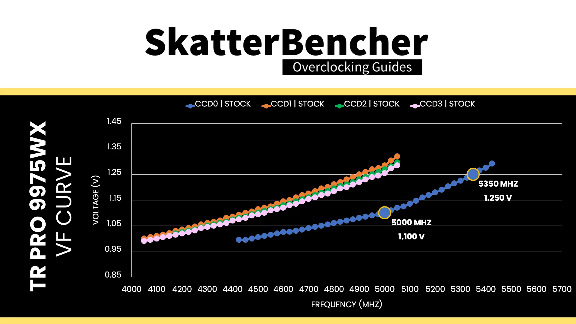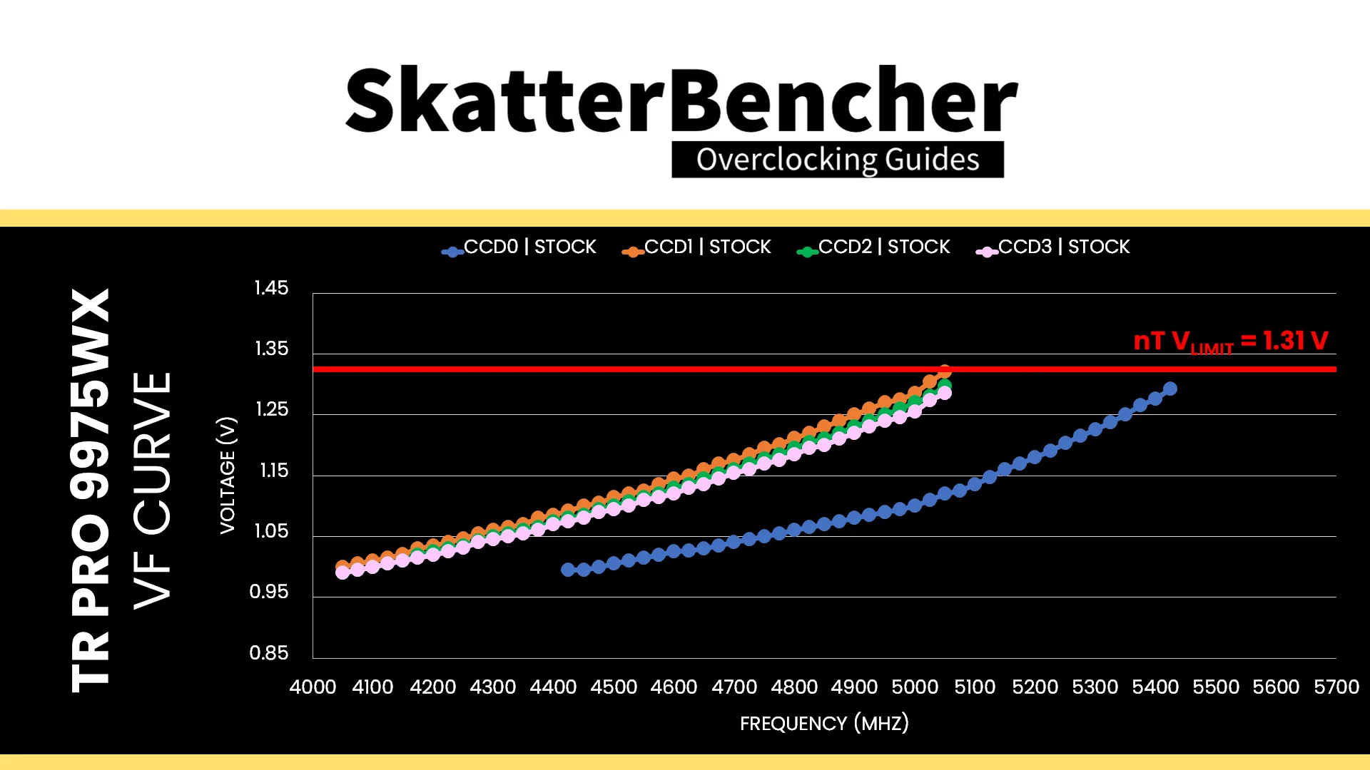 On multi-CCD processors like the Ryzen Threadripper Pro 9975WX, each CCD has its own Fmax. The Fmax for CCD0 is 5450 MHz and the Fmax for the other CCDs is 5050 MHz.