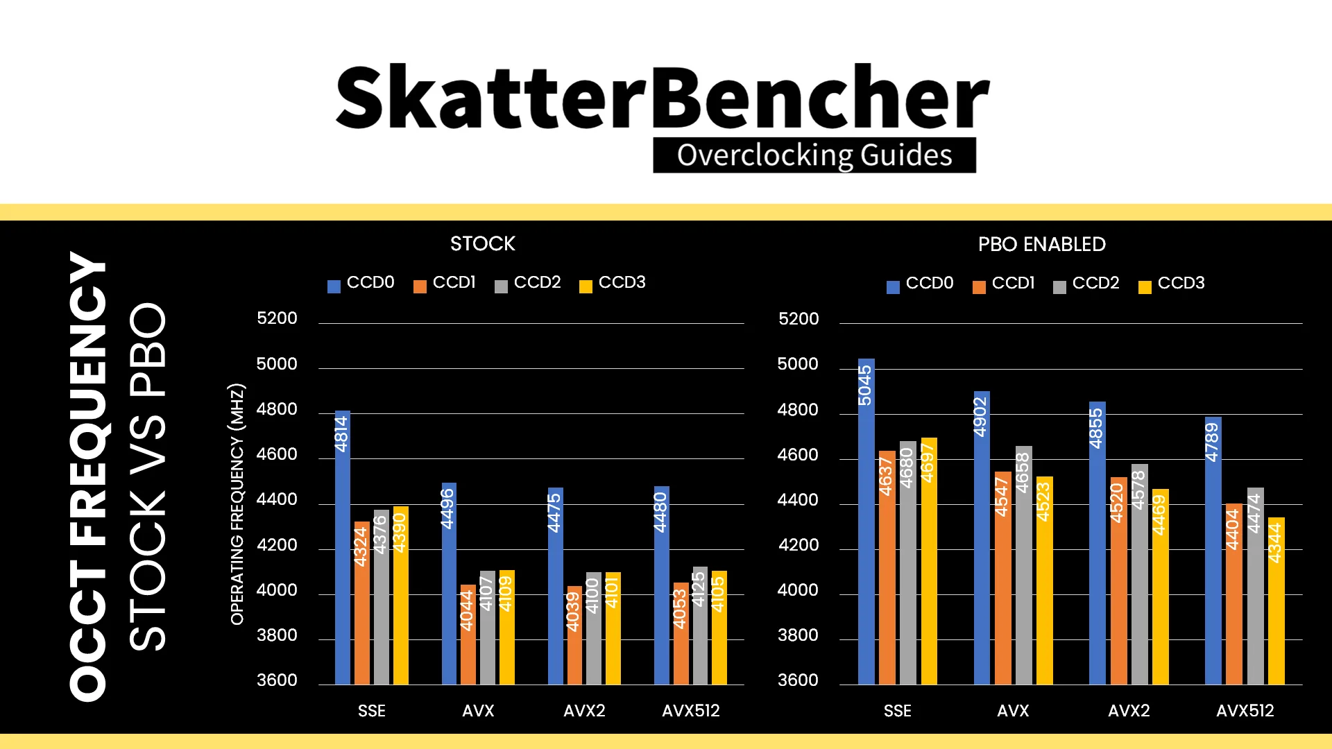 Across the various OCCT workloads – SSE, AVX, AVX2, and AVX512 – enabling PBO increases the operating frequency by up to 13.42% or 551 MHz.