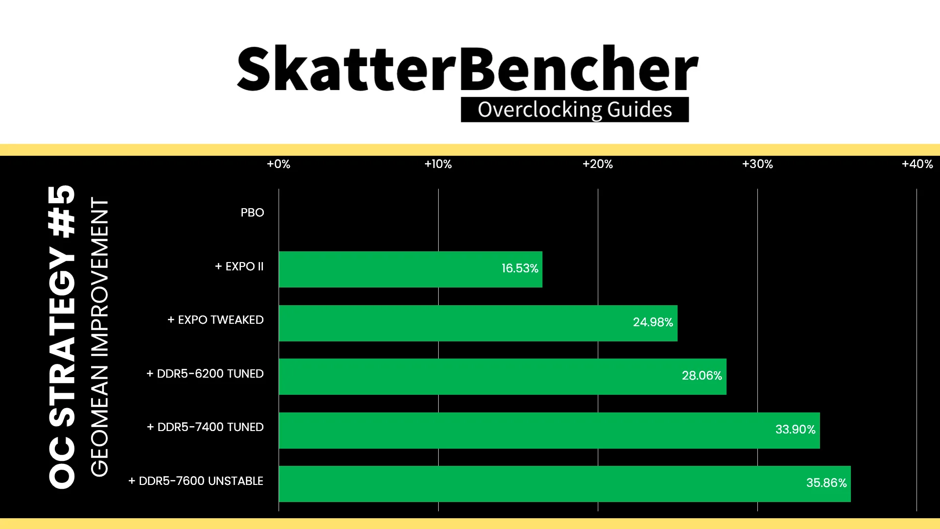 Going from DDR5-7400 to 7600 is not an incredibly large increase in memory frequency but by keeping the memory timings the same, we see an improvement in performance across the board. The Geomean performance speedup increases by another two percentage points to +35.86%, and we get a maximum benchmark improvement of +41.60% in PyPrime.